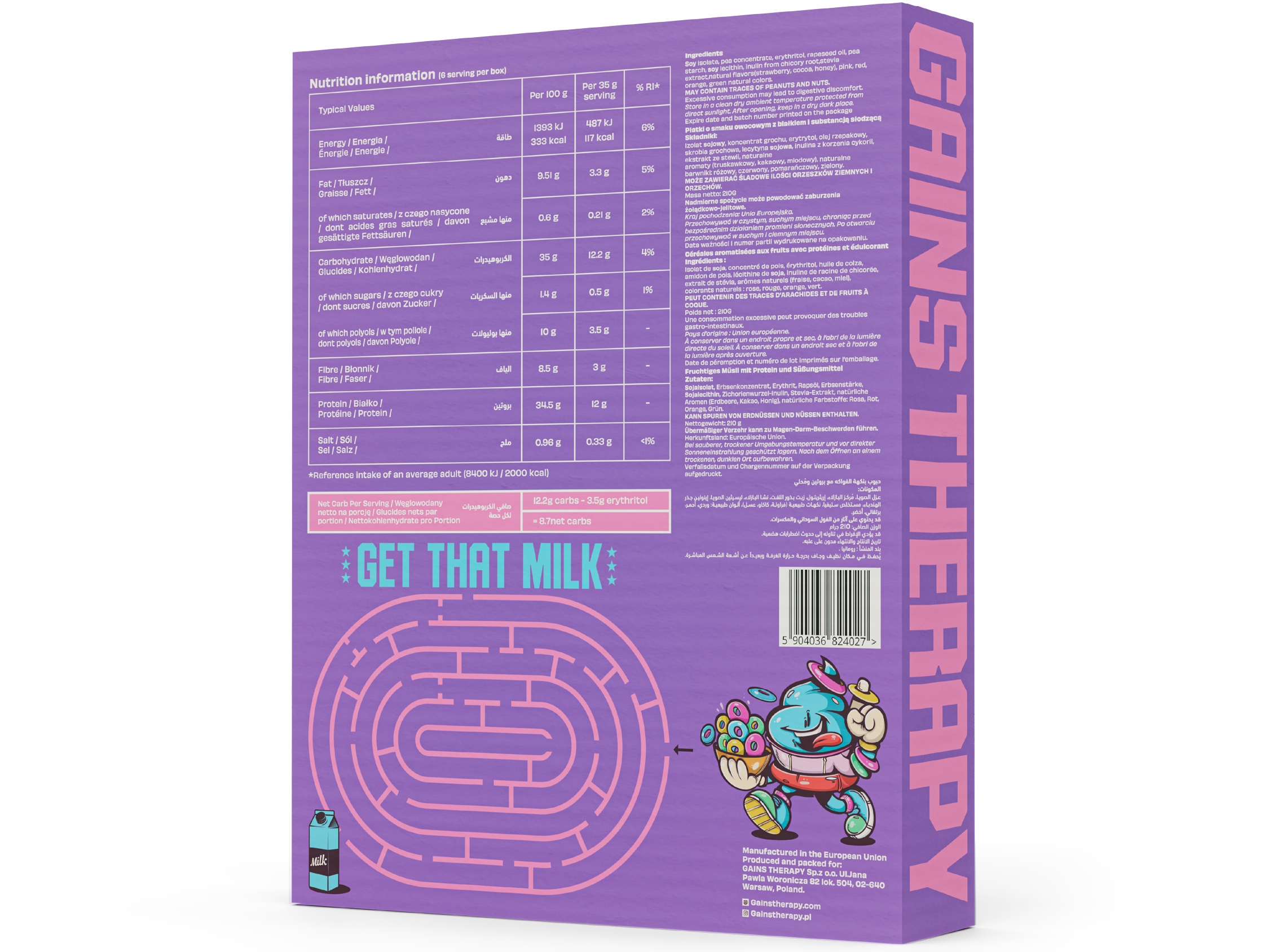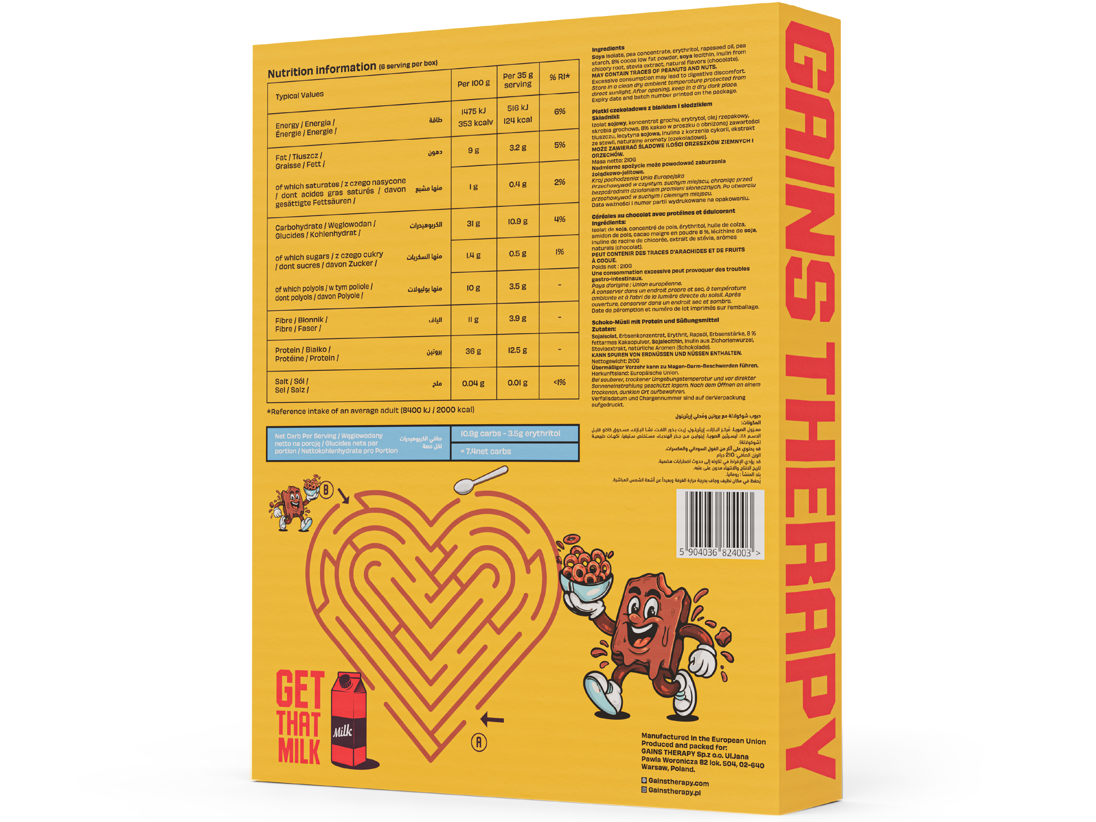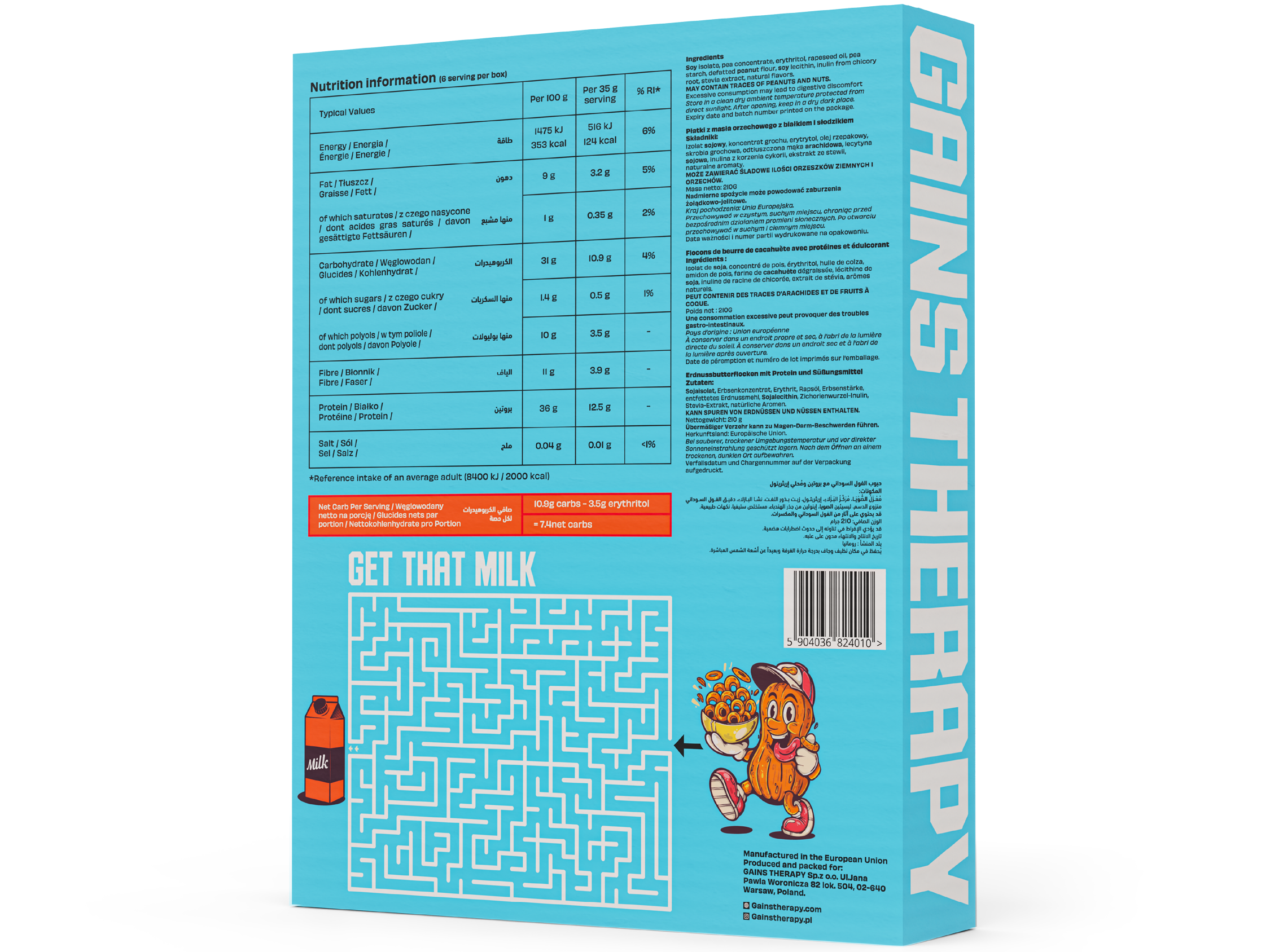 Niezależnie od tego, czy dążysz do osiągnięcia celów fitness, ograniczasz spożycie węglowodanów, czy po prostu chcesz zjeść sycące śniadanie Gains Therapy® są idealnym rozwiązaniem. Wsyp je do miski z mlekiem, posyp jogurtem lub jedz prosto z pudełka. Twoje śniadanie właśnie zyskało nową jakość. Gains Therapy® Cereal to sposób na rozkoszowanie się bogatym smakiem bez wyrzutów sumienia, a jednocześnie dostarczenie organizmowi dużej dawki białka.